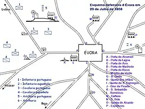 ![]() Defensa de Évora el 29 de julio de 1808, según el croquis publicado en la História Popular da Guerra Peninsular de J. Teixeira Botelho. | ||||