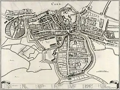Caen era una ciudad antigua en la orilla norte del río Orne y dividida en dos por el río Odon. La parte vieja estaba amurallada y custodiada por un castillo casi inexpugnable, sin embargo, era vulnerable una vez destruida la muralla. La parte nueva de la ciudad era un barrio rico que acogía a mercaderes y terratenientes y que se disponía en la isla formada entre los ríos. Esta zona de Caen era la más fácilmente defendible, ya que se encontraba, casi en su totalidad, rodeada de agua y a ella se accedía mediante tres puentes fortificados. No obstante, en verano el caudal de los ríos descendía notablemente y era posible cruzarlos a nado -aunque el riesgo de irse con la corriente era considerable. Además, la ciudad contaba con dos abadías fortificadas, una a cada lado del perímetro de la muralla y que podían servir como bastiones si Caen era atacada.