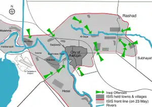 El 26 de mayo, el Estado Islámico perdió la ciudad de Garma, a 16 kilómetros de Faluya. Según la coalición, 20 bombardeo Faluya táctil del 23 al 27 de mayo de mató a 70 yihadistas, incluyendo Maher al-Bilawi, comandante de las fuerzas en este del estado islámico. La lucha tiene lugar principalmente en el sur y el noroeste de la ciudad, en los alrededores de Saklaouiya.[10] El 31 de mayo, el ejército iraquí afirma haber repelido un ataque contra yihadista en la localidad Naimiyah, a 500 metros del distrito de Shuhada al sur de Faluya, matando a 75 hombres de los 100 que han participado en esta operación.[11] Las fuerzas iraquíes, sin embargo, se enfrentan a una resistencia muy fuerte del ISIS y no progresan durante dos días. El 1 de junio, los yihadistas atacan aldeas al norte de Faluya Kubaisah y al-Sejar y qu'Amiriyat Faluya al sur con al menos 10 atacantes suicidas; según Al Yazira por lo menos 130 soldados iraquíes murieron en los combates, mientras que la AFP después de más de 70 ataúdes milicianos chiíes fueron enterrados en el cementerio de la "Valle de la Paz" en Nayaf desde el inicio de la ofensiva. Por la noche, el primer ministro iraquí, Haider al-Abadi anunció que el asalto a la ciudad se suspende con el fin de "proteger a los civiles".[12]