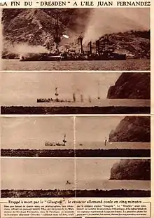 El Glasgow abrió fuego contra el Dresden, dañando el barco y prendiéndole fuego. Después de devolver el fuego durante un corto período de tiempo, el capitán del Dresden decidió que la situación era desesperada ya que su barco estaba muy superado en armamento y número, mientras estaba varado en la bahía con depósitos de carbón vacíos y motores desgastados. El capitán Lüdecke dio la orden de abandonar y hundir su barco. La tripulación alemana huyó del crucero en botes salvavidas descubiertos para llegar a la seguridad de la isla, que era territorio neutral. Los cruceros británicos continuaron disparando contra el Dresden y los botes que huían hasta que el crucero ligero finalmente explotó, pero no está claro si la explosión fue causada por los disparos de los barcos británicos o por las cargas de hundimiento colocadas por los alemanes. Después de que el barco explotó, el comandante británico ordenó a sus barcos capturar a los supervivientes del Dresden. Tres alemanes murieron en combate y 15 resultaron heridos. Los británicos no sufrieron bajas mortales. [5]