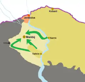 A finales de diciembre de 2015, las milicias kurdas de las YPG y YPJ (miembros de las Fuerzas Democráticas Sirias) capturaron la presa de Tishri, presa que conecta la región de Kobane con la ciudad de Manbiŷ a través del río Éufrates. Al capturar la ciudad de Tishri y otras aldeas cercanas de manos yihadistas, comenzaron a pavimentar las carreteras para poder poner en marcha el avance hacia Manbiŷ.