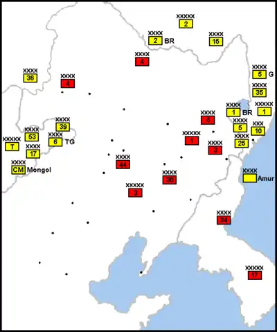 | Lugar | Manchuria, Mongolia Interior, el norte de la península coreana, Isla de Sajalín e Islas Kuriles | |||