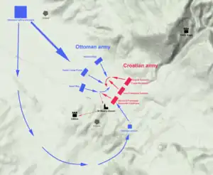 El plan turco era atraer a las fuerzas cristianas más al oeste, junto al bosque donde les habían tendido una emboscada. El ala derecha de Ismail hizo el primer movimiento, dirigiéndose hacia el flanco izquierdo croata. El ejército cristiano dejó las laderas y se precipitó hacia los musulmanes, comenzando una batalla en campo abierto. La lucha fue peleada cuerpo a cuerpo con espadas, sin usar arcos.[18][21] Los otomanos fueron al principio empujados hacia atrás y comenzaron una retirada fingida, atrayendo a los croatas a una persecución que los llevó a la trampa.