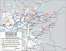 A medida que los coreanos preparaban sus posiciones defensivas al anochecer del 25 de noviembre, dos cuerpos chinos se movilizaban para un contraataque decisivo en contra del flanco derecho del Octavo Ejército.[50] El 38.º Cuerpo del EPV planeaba atacar con toda su fuerza el centro y el flanco derecho de la 7.ª División de Infantería de la RC, mientras que dos divisiones del 42.º Cuerpo comenzaron a marchar a través de las colinas para poder eludir y rebasar el flanco derecho de la 8.ª División de Infantería de la RC.[58] Dada la importancia de este asalto, Han Xianchu, uno de los oficiales de Peng, comandó personalmente los 38.º y 42.º Cuerpos por el resto de la batalla.[59]