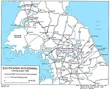 Con la 2.ª División de Infantería de los EUA, la Brigada Turca y el II Cuerpo de la RC fuera de combate, el Octavo Ejército se vio reducido a solo dos cuerpos, compuestos de cuatro divisiones y dos brigadas.[211] Mientras tanto, el sobre extendido sistema logístico chino también había dejado a su 13.º ejército privado de suministros e incapaz de continuar operaciones ofensivas.[212][213] Pero durante las caóticas retiradas de las Naciones Unidas, no se realizó ningún reconocimiento para determinar el estado de las fuerzas chinas.[2] Como resultado de esto, Walker ordenó al Octavo Ejército a abandonar Corea del Norte el 3 de diciembre,[211][214] para la sorpresa de los comandantes chinos.[215] Este repliegue de 120 kilómetros al paralelo 38 es conocido en ocasiones como "la retirada más larga en la historia militar estadounidense".[216][217][218] El Octavo Ejército en su totalidad también estaba acosada por una "bug out fever" (lit. fiebre de salir pitando) durante el repliegue,[219] y una canción llamada el "Bugout Boogie" fue compuesta para conmemorar la derrota del Octavo Ejército.[220] Walker murió dos días antes de la Navidad de 1950, y el Teniente General Matthew B. Ridgway asumió el mando del Octavo Ejército.[221] En las Naciones Unidas, todas las esperanzas de una Corea unificada fueron abandonadas, y un cese al fuego en el paralelo 38 fue propuesto a China el 11 de diciembre de 1950.[222]