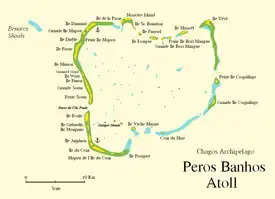 Mapa del atolón Peros Banhos que muestra Benares Shoals en la parte superior izquierda