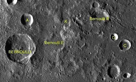 Por convención estos elementos son identificados en los mapas lunares poniendo la letra en el lado del punto medio del cráter que está más cerca de Bernoulli.