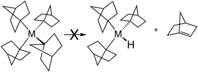Existen varias estrategias para evitar la β-eliminación de hidruro. La estrategia más común es emplear ligandos alquilo que carecen de hidrógeno en la posición β (los más comunes son metilo y neopentilo). La beta eliminación también se inhibe cuando la reacción tiene que producir un alqueno con una gran tensión angular. Esta situación se ilustra por ejemplo con la estabilidad de los complejos de metal que contienen ligandos norbornilo:[2]