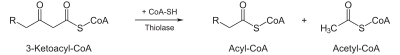 El paso final para la ruptura del cetoacil-CoA entre C-2 y C-3 por el grupo tiol de otra molécula de CoA. Esta reacción es catalizada por β-cetotiolasa y da lugar a una molécula de acetil CoA y un acil CoA con dos carbonos menos.