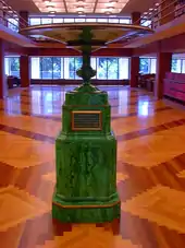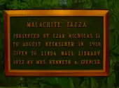 "La Tazza", una de las piezas más grandes de malaquita en América del Norte, se destaca como el punto focal en el centro de la sala de lectura principal, que cuenta con suelos de madera, paneles y estantes de roble, y ventanas grandes que dan al jardín sur.