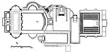 Siguiendo la tradición de las grandes bibliotecas romanas, la Biblioteca Ulpia dividía sus colecciones en latín y griego, ubicadas en espacios opuestos separados por un patio columnado junto a la Columna de Trajano.[10] Esta estructura de dos pisos aprovechaba la iluminación natural mediante altos techos abovedados y contaba con bahías separadas por columnas frente a pilastras, creando nichos para los libros y rollos. Las pasarelas permitían el acceso a las estanterías, y recesos en los extremos albergaban estatuas, presumiblemente de Trajano y quizás de Minerva. Se estima que cada biblioteca contenía alrededor de diez mil rollos, además de materiales archivísticos significativos, incluidos edictos y decretos, así como obras destacadas como la autobiografía de César y los comentarios de Trajano sobre las Guerras dacias.[11] El diseño, que priorizaba la estética y la funcionalidad para la lectura, no contemplaba la expansión de la colección.