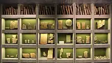 Las tablillas solían estar organizadas según su forma: las de cuatro lados eran para las transacciones financieras, mientras que las redondas registraban información agrícola. (En esta época, algunos documentos escritos también estaban en madera y otros en tablillas de cera). Las tablillas se separaban según su contenido y se colocaban en diferentes salas: gobierno, historia, derecho, astronomía, geografía, etc. Los contenidos se identificaban mediante marcas de color o breves descripciones escritas, y a veces por el "incipit", o las primeras palabras que iniciaban el texto.[20]