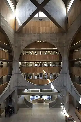 Kahn estructuró la biblioteca en 3 anillos concéntricos. El anillo exterior está construido con un muro de carga de ladrillo, incluye las paredes exteriores y los espacios de lectura. El anillo intermedio, que está construido con hormigón armado, sostiene los grandes bloques de libros. El anillo interior es un espacio abierto con enormes aperturas circulares que muestran las plantas con las estanterías.
