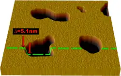 Un nuevo método para estudiar las bicapas lipídicas es la microscopía de fuerza atómica (AFM). En lugar de utilizar un haz de luz o partículas, una pequeña punta afilada explora la superficie al hacer contacto físico con la bicapa y moviéndose a través de ella, como un jugador de la aguja. AFM es una técnica prometedora, ya que tiene el potencial de imagen con una resolución nanométrica a temperatura ambiente e incluso bajo el agua o tampón fisiológico, condiciones necesarias para el comportamiento bicapa natural. Utilizando esta capacidad, AFM se ha utilizado para examinar el comportamiento dinámico de la bicapa incluyendo la formación de poros transmembranales (agujeros)[37] y las transiciones de fase en bicapas soportadas.[40] Otra ventaja es que AFM no requiere de una etiqueta fluorescente o isotópica de los lípidos, puesto que la punta de la sonda interactúa mecánicamente con la superficie bicapa. Debido a esto, la misma imagen puede escanear ambos lípidos y proteínas asociadas, a veces incluso con una resolución de una sola molécula.[37][41] AFM también puede sondear la mecánica natural de las bicapas lipídicas.[42]