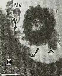 Exocitosis en procariontes: La exocitosis de membrana vesicular, popularmente conocida como el tráfico de vesículas de membrana, ganador del premio Nobel (año 2013) es tradicionalmente considerado como una prerrogativa de las células eucariontes.[52] Sin embargo, este mito se rompió con la revelación de que nanovesículas, popularmente conocidas como vesículas de membrana externa bacteriana, dadas a conocer por los microorganismos gram negativas, trasladan moléculas de señal bacterianas para hospedar u objetivar a células[53] para llevar a cabo múltiples procesos a favor del microbio segregador, por ejemplo, en la invasión de la célula huésped[54] y en las interacciones microbio-medio ambiente, en general.[55]