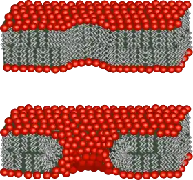 es una medida de la cantidad de energía que se necesita para exponer un borde de la bicapa al agua rasgando la bicapa o la creando un agujero en ella. El origen de esta energía es el hecho de que, al crear tal interfaz, expone algunas de las colas de lípidos al agua, pero la orientación exacta de estos lípidos del borde es desconocida. Existe alguna evidencia de que tantos poros hidrofóbicos (colas rectas) e hidrofílicos (cabezas curvadas alrededor de) pueden coexistir.[66]