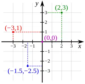 Posteriormente, el plano se describió en un sistema de coordenadas llamado cartesiano, un sistema de coordenadas que especifica cada punto de forma única en un plano por un par de coordenadas numéricas, que son las distancias firmadas desde el punto a dos líneas directas perpendiculares fijas, medidas en la misma unidad de longitud. Cada línea de referencia se llama eje de coordenadas o simplemente eje del sistema, y el punto donde se encuentran es su origen , generalmente en un par ordenado (0, 0). Las coordenadas también se pueden definir como las posiciones de las proyecciones perpendiculares del punto sobre los dos ejes, expresadas como distancias con signo desde el origen.