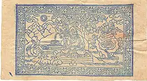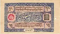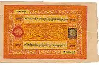 Los primeros billetes del Tíbet se emitieron entre 1912 y principios de 1913 (1658-59 del calendario tibetano), con valores faciales de 5 (verde o azul), 10 (rojo), 15 (violeta), 25 (marrón o amarillo) y 50 (azul o púrpura) tam,[1] numerados a mano con tinta negra por calígrafos autóctonos especialmente entrenados para ello. Presentan en el anverso un sello rojo a la izquierda, símbolo de la autoridad del dalái lama, otro, negro a la derecha, de la «Tesorería del Gobierno» o «Banco del Gobierno», junto al siguiente texto escrito en alfabeto 'Phags-pa: