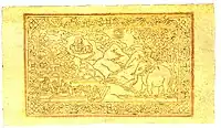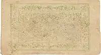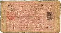 chos srid gnyis ldan gyi rab byung bco lnga bai shog dngul1658 años desde la fundación de la secular forma religiosa de gobierno en el gran país del Tíbet, la tierra de las nieves, el papel moneda del 15.º ciclo (rab byung) del gobierno de la religión y la política (chos srid gnyis ldan), la joya universal de beneficio y bendición, dotada de las cuatro clases de auspicios.Traducción propuesta por el personal del Tibetan Works and Archives de Dharamsala.