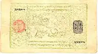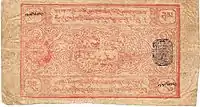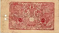 Cabe mencionar por último las series de 10, impresas en tres colores (rojo, azul y negro) entre 1940 y 1948, 5 –también sin fecha– y 25 srang, emitidas de 1950 a 1955.