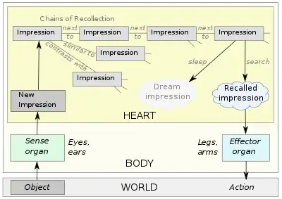En su obra Acerca del alma, Aristóteles aborda el tema de la memoria señalando que los recuerdos de uno son impresiones pero no registros confiables de lo que realmente sucedió.[93] La memoria es pues la capacidad de mantener una experiencia percibida en la mente y distinguir entre la "apariencia" interna y una ocurrencia en el pasado.[94] En otras palabras, un recuerdo es una imagen mental que se puede recuperar. Aristóteles creía que quedaba una impresión en un órgano corporal semifluido que sufre varios cambios para crear un recuerdo. Un recuerdo se produce cuando estímulos como las imágenes o los sonidos son tan complejos que el sistema nervioso no puede recibir todas las impresiones a la vez. Estos cambios son los mismos que los involucrados en las operaciones de la sensación, el "sentido común" aristotélico y el pensamiento.[95][96]