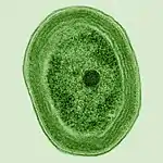 Entre el fitoplancton en la base de la red alimentaria del océano hay miembros de un filo de bacterias llamadas cianobacterias. Las cianobacterias marinas incluyen los organismos fotosintéticos más pequeños conocidos. El más pequeño de todos, Prochlorococcus, tiene solo 0.5 a 0.8 micrómetros de ancho.[14] En términos de números individuales, Prochlorococcus es posiblemente la especie más abundante en la Tierra: un solo mililitro de agua de mar superficial puede contener 100 000 células o más. En todo el mundo, se estima que hay varios octillones (~ 1027) de individuos. El proclorococo es ubicuo entre 40°N y 40°S y domina en las regiones oligotróficas (pobres en nutrientes) de los océanos.[15] La bacteria representa aproximadamente el 20 % del oxígeno en la atmósfera de la Tierra y forma parte de la base de la cadena alimenticia del océano.[16]