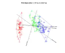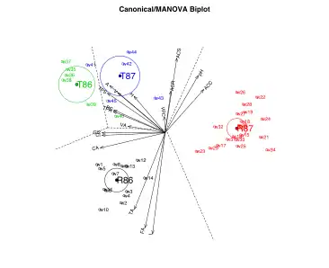 Inicialmente propuesto por Gabriel (1972),[2] aunque su aplicación no se desarrolló probablemente debido a que estaba publicado en una revista de meteorología. Cuando las filas de la matriz de datos tienen una estructura de grupos definidos a priori y el propósito es buscar las diferencias entre grupos, el ACP y los métodos biplot clásicos no son apropiados. La técnica clásica para analizar la estructura de grupos sería un Análisis Multivariante de la Varianza para contrastar las diferencias, un Análisis Discriminante para clasificar un individuo nuevo o un Análisis Canónico de Poblaciones (ACPo) (también conocido Factorial Discriminante, Coordenadas Discriminantes) para representar gráficamente los resultados de las dos técnicas anteriores. Es posible realizar una representación biplot del ACPo como se describe a continuación: