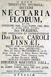 En junio de 1762, defendió su disertación de tesis botánica Nectaria Florum ante el profesor Linneo. El tema era la presencia de glándulas de miel de las flores, de que clases son y cómo trabajan. Fue el primer informe detallado sobre la materia y dio ejemplos de flores con tipos diferentes de glándulas de miel o nectaria. Linneo lo tuvo en 1763 publicando el ensayo en el volumen VI de Amoenitates Academicae ('distracciones académicas'). En 1778 el Dr. Hall brindó su traducción sueca propia de este trabajo pionero. El discípulo de Linneo y estudiante amigo Carl Peter Thunberg nombró especies fanerógamas y especies frutales en su honor. Y también un genus perteneciente a la familia de las legumbres, con el nombre Hallia.[2]