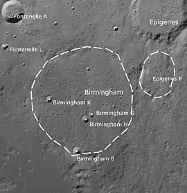 Por convención estos elementos son identificados en los mapas lunares poniendo la letra en el lado del punto medio del cráter que está más cerca de Birmingham.