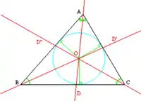 - Las tres bisectrices de los ángulos internos de un triángulo se cortan en un único punto, que equidista de los lados. Este punto se llama el incentro del triángulo y es el centro de la circunferencia inscrita al triángulo. Esta circunferencia es tangente a cada uno de los lados del triángulo.