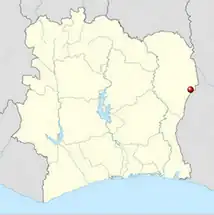 Se encuentra ubicado al noreste del país, cerca de la frontera con Ghana y de la orilla oriental del río Komoé.