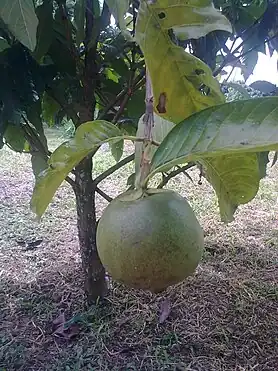 La fruta es globosa, tiene de 7 a 12 cm de diámetro, es de verde a marrón. Se recoge del suelo al madurar completamente. Pesa entre 740 y 1000 gramos, de los cuales son con pulpa el 88%. Esta pulpa es ácida y densa; contiene principalmente fructosa y glucosa, y cantidades importantes de proteínas, fósforo y vitaminas B y C, así como aportes de calcio y hierro. Se utiliza para preparar compotas, mermeladas, caramelos, vino y el famoso jugo del amor, con supuestas propiedades afrodisíacas.