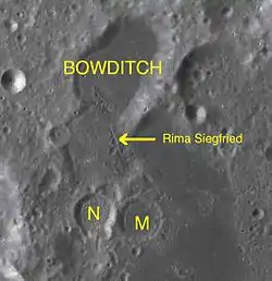 Por convención estos elementos son identificados en los mapas lunares poniendo la letra en el lado del punto medio del cráter que está más cerca de Bowditch.