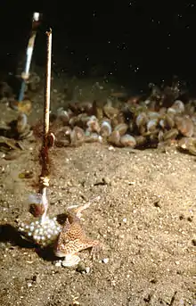 Hembra cuidando la puesta en el tallo de una ascidia, en su medio