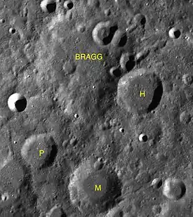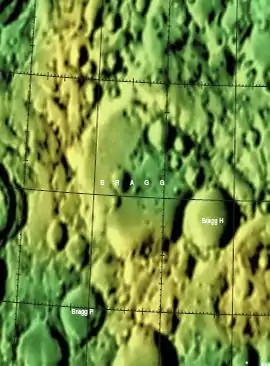 Bragg es un antiguo cráter de impacto que se encuentra en la cara oculta de la Luna, justo más allá de su extremo noroeste. Esta formación ha sido fuertemente erosionada y reconfigurada por impactos posteriores, dejando una depresión irregular en la superficie. La parte más intacta del borde se sitúa a lo largo de la cara occidental, mientras que el lado norte y este casi han desaparecido, invadidos por varios cráteres más pequeños. El más notable de ellos es Bragg H, que se encuentra al otro lado del perímetro este-sudeste.