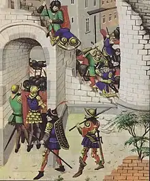 - Montar la brecha, Dar el asalto introduciéndose por la muralla derruida, escalar los escombros etc.[2]