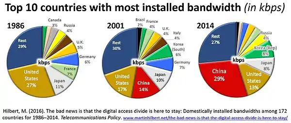 Existe una gran desigualdad a nivel mundial en cuanto a la distribución del ancho de banda de telecomunicaciones instalado. En 2014, tres países (China, Estados Unidos, Japón) albergaban el 50% del potencial de ancho de banda instalado en el mundo e históricamente entre el 70% y el 75% ha sido albergado por solo diez países (véase la figura de la derecha).[2] Estados Unidos perdió su liderazgo mundial en términos de ancho de banda instalado en 2011, siendo reemplazado por China, que albergaba más del doble del potencial de ancho de banda nacional en 2014 (29 % frente al 13 % del total mundial de Estados Unidos).[2]