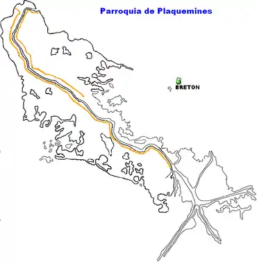 Localización de Breton en el mapa de la Parroquia de Plaquemines.