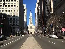 ![]() Broad Street al norte de Walnut Street en el centro de Filadelfia, hacia el Ayuntamiento. | ||