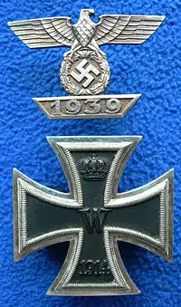 Un titular de la Cruz de Hierro de 1914 podría recibir un segundo grado o más alto de la Cruz de Hierro de 1939. Para permitir que las dos medallas se usen juntas, se usaría un "Broche de 1939" (Spange) en la Cruz de Hierro original de 1914.[2] Representaba a un águila nacional que sostenía una corona de hojas de roble que rodeaba una esvástica sobre un trapecio que llevaba el año 1939.[2] El broche se adjuntó a la cinta de medalla de la Cruz de Hierro de 1914 La cinta se usó luego a través de un botón de túnica del uniforme.[2]