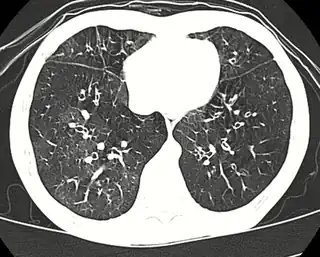 ![]() Tomografía computada de alta resolución mostrando una bronquiolitis obliterante con atenuación en mosaico, broquiectasias, atrapamiento aéreo y engrosamiento bronquial[2] | ||