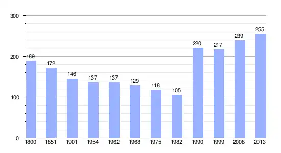 Los datos demográficos contemplados en este gráfico de la comuna de Brunville[4] se han cogido de 1800 a 1999 de la página francesa EHESS/Cassini, y los demás datos de la página del INSEE.[5]