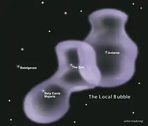 Impresión artística de la Burbuja Local, conteniendo el Sol y Murzim (β Canis Majoris), y la Burbuja Loop I, conteniendo Antares (α Scorpii).