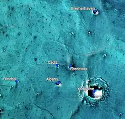 - Coordenada fijada tomando como base la latitud planetocéntrica con longitud Oeste; véase Unión Astronómica Internacional (noviembre de 2010). «Cádiz on Mars» (en inglés). Consultado el 23 de diciembre de 2010.