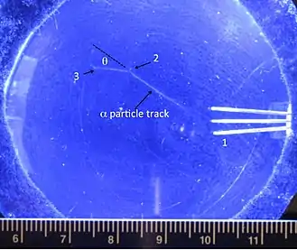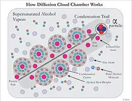 El vapor de isopropanol, metanol u otro alcohol satura la cámara. El alcohol desciende al enfriarse y el condensador frío proporciona un gradiente de temperatura pronunciado. El resultado es un ambiente sobresaturado. Cuando las partículas cargadas energéticas atraviesan el gas, dejan estelas de ionización. El vapor de alcohol se condensa alrededor de las estelas de iones gaseosos dejadas por las partículas ionizantes. Esto ocurre porque las moléculas de alcohol y agua son polares, lo que provoca una fuerza de atracción neta hacia una carga libre cercana (véase la Fig. 4). El resultado es una formación brumosa parecida a una niebla, que se aprecia por la presencia de gotas que caen hacia el condensador. Cuando las huellas se emiten desde una fuente radioactiva, su punto de origen puede determinarse fácilmente.[2] La Fig. 5 muestra un ejemplo de una partícula alfa procedente de una fuente tipo pin de Pb-210 sometida a dispersión de Rutherford.