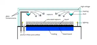 Una cámara de niebla sencilla de tipo difusión consiste en un entorno sellado, una placa superior caliente y una placa inferior fría (véase la Fig. 3). Requiere una fuente de alcohol líquido en el lado caliente de la cámara donde el líquido se evapora, formando un vapor que se enfría al caer a través del gas y se condensa en la placa inferior fría. Se necesita algún tipo de radiación ionizante.