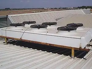 - condensador con ventilador para enfriarlo (cabe señalar que no siempre se encuentra al interior de la sala de máquinas debido a que debe liberar gran cantidad de calor, conforme la magnitud de la instalación)