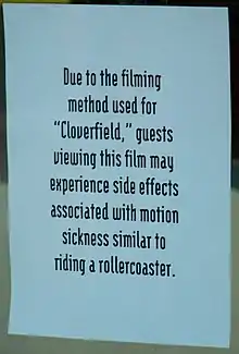 Las películas Cloverfield (2008) y Friday Night Lights (2004) son descritas como capaces de hacer sentir mareado o enfermo al espectador. Sin olvidar las famosas Chronicle (2012) y Proyecto X (2012)[11][12]