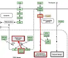 Las alteraciones somáticas en las rutas de la MAPK (Kinasa activada por mitógenos) y PI3K, dos rutas requeridas para la proliferación y supervivencia de las células cancerígenas. La ruta oncogénica más frecuentemente alterada por mutaciones (13 %) es la vía de la PI3K, seguida por la ruta mediada por PTEN.