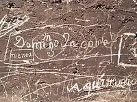 Aquí se nos muestra el nombre Domingo Lacome, posiblemente de origen francés. Además en la parte inferior izquierda de dicha inscripción aparece escrito menot, posiblemente haciendo referencia a la palabra francesa menotté (esposado), y diciéndonos así las condiciones en las que se hallaba este reo.